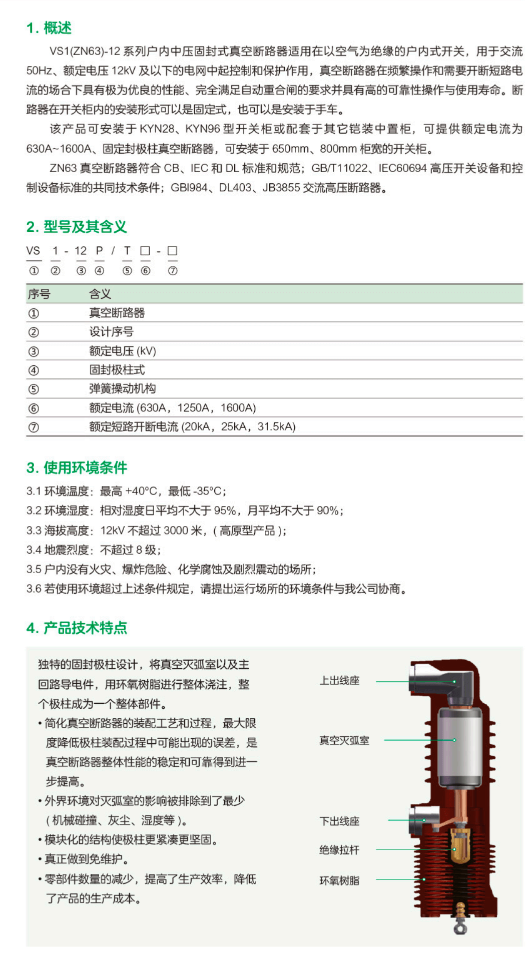 VS1(ZN63)-12系列户内中压固封式真空断路器适用在以空气为绝缘的户内式开关,用于交流50H忆、额定电压12KW及以下的电网中起控制和保护作用,真空断路器在频繁操作和需要开断短路电流的场合下具有极为优良的性能、完全满足自动重合闸的要求并具有高的可靠性操作与使用寿命。断路器在开关柜内的安装形式可以是固定式,也可以是安装于手车。